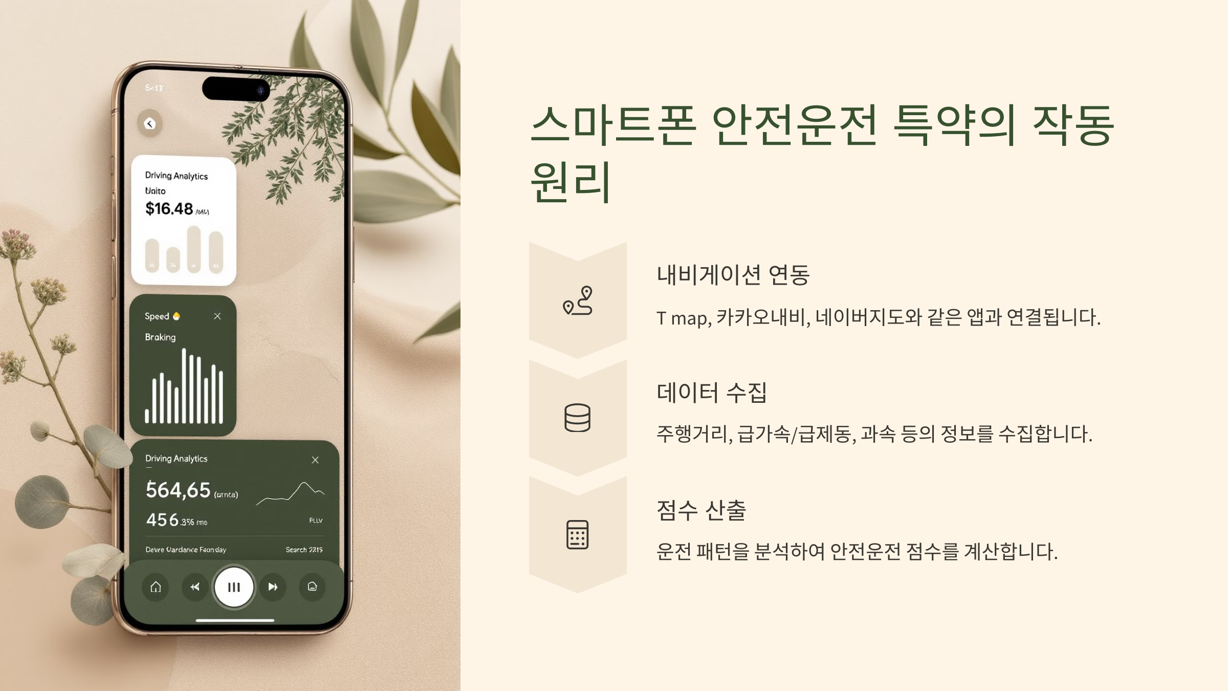 일부 보험사 앱은 가속, 급정거, 급회전, 과속 같은 운전 습관까지도 분석해요. 단순히 '휴대폰을 사용하지 않았다'는 것뿐 아니라 전반적인 운전 태도까지 평가 대상이 되는 거예요. 그리고 그 결과에 따라 다음 해 보험료가 최대 10~15%까지 할인될 수 있어요.